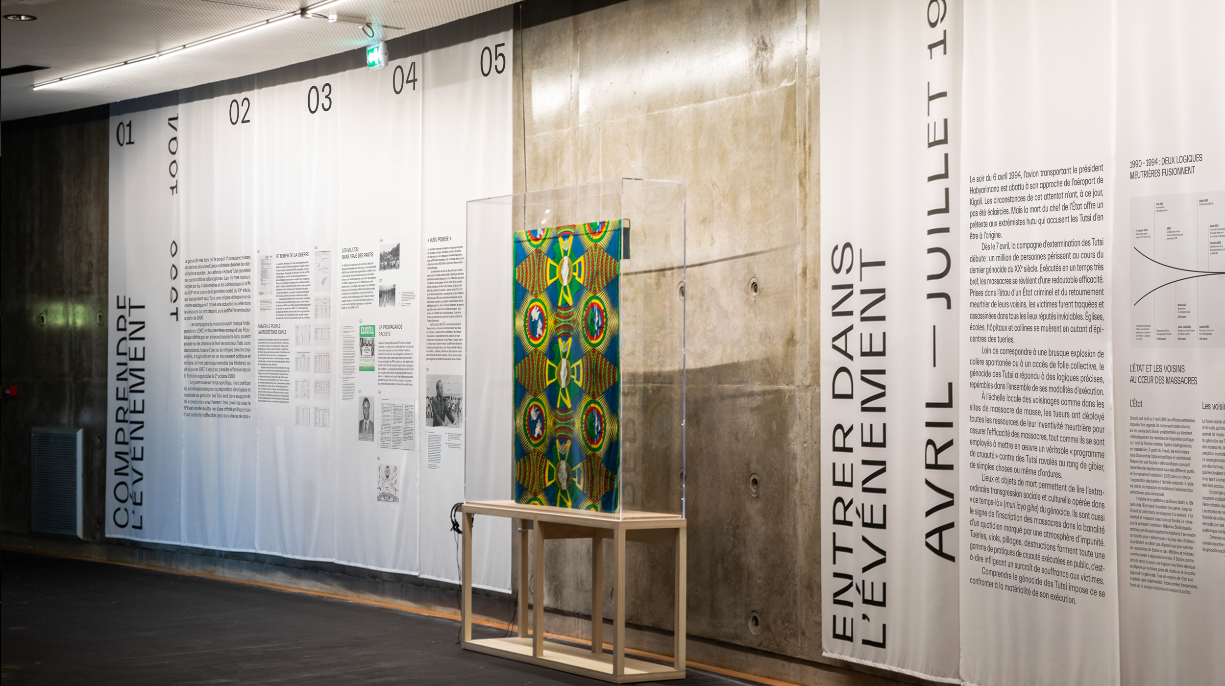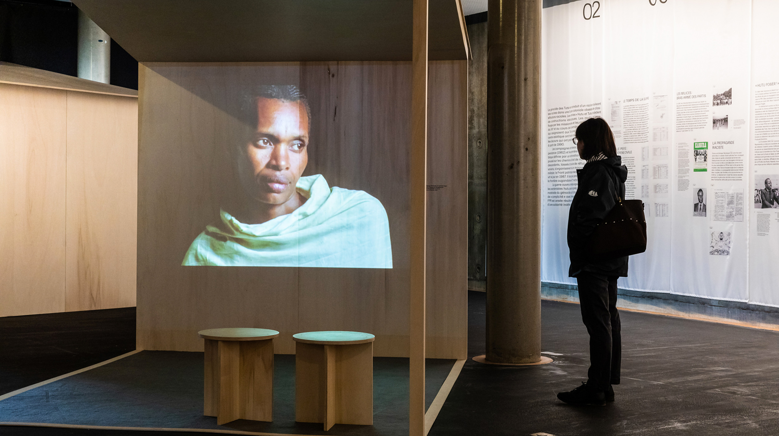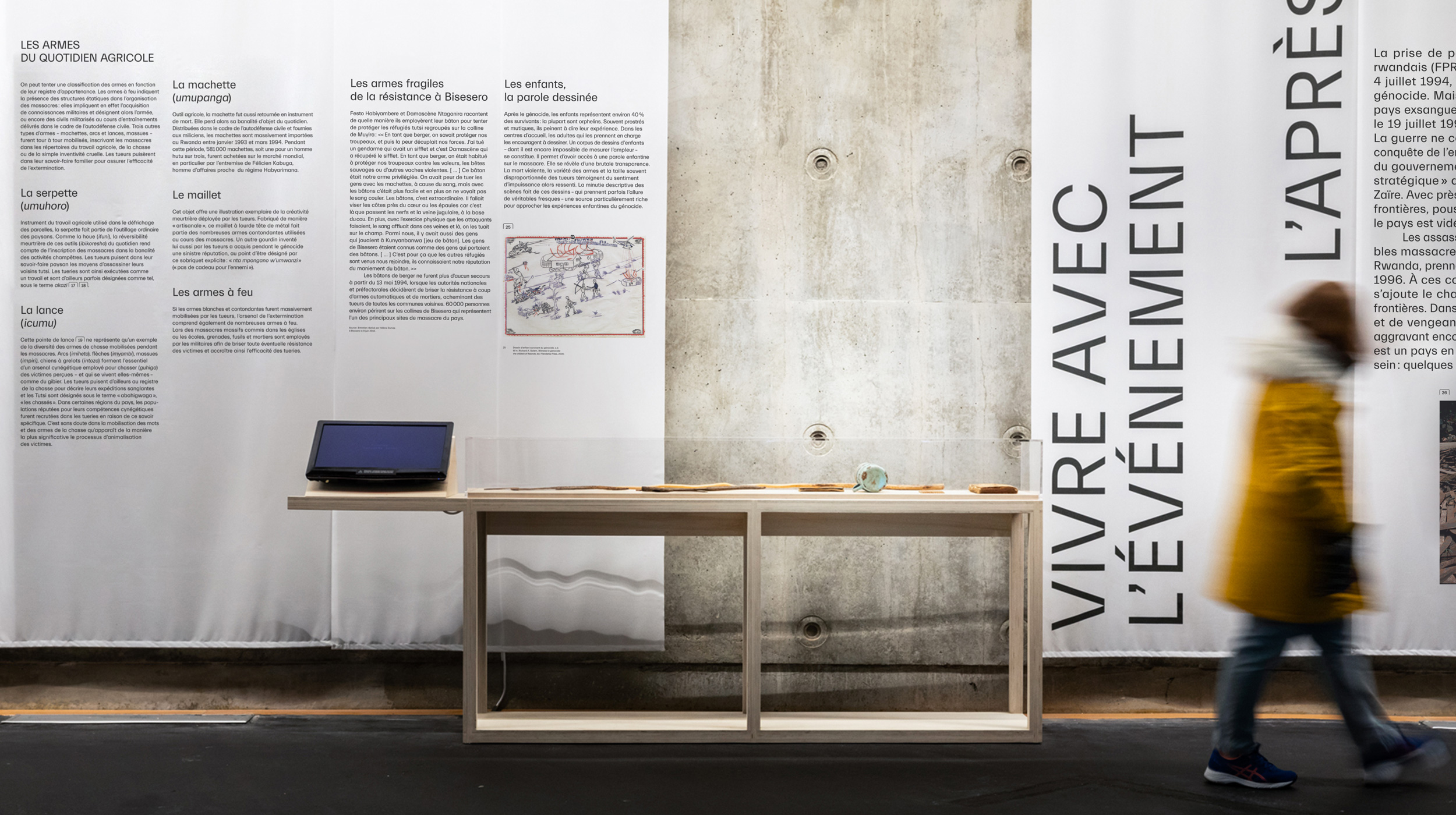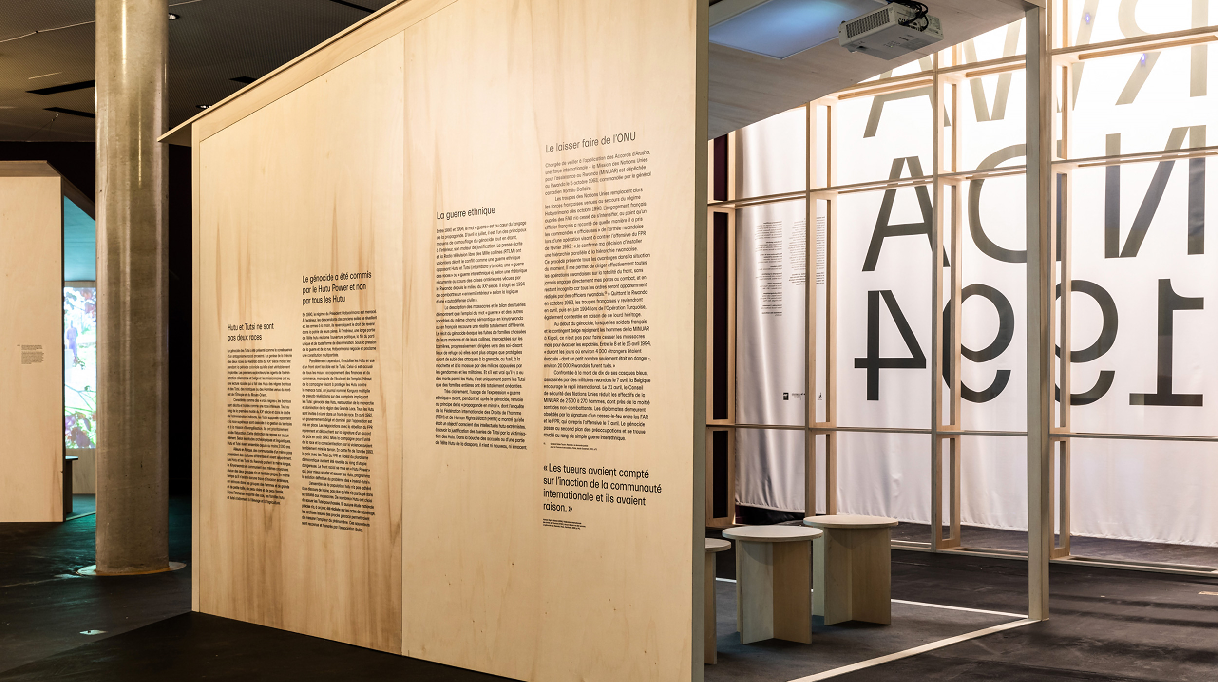 It’s been a pleasure working on «Rwanda 1994» exhibition with Designers Unit. Designed as a tribute for the 25th anniversary of the Rwandan genocide, the exhibition ties together videotaped testimonies and historical facts. The scenography refers to the martyr village, while the graphic design — printed on semi-transparent veils — meets his duty of remembrance