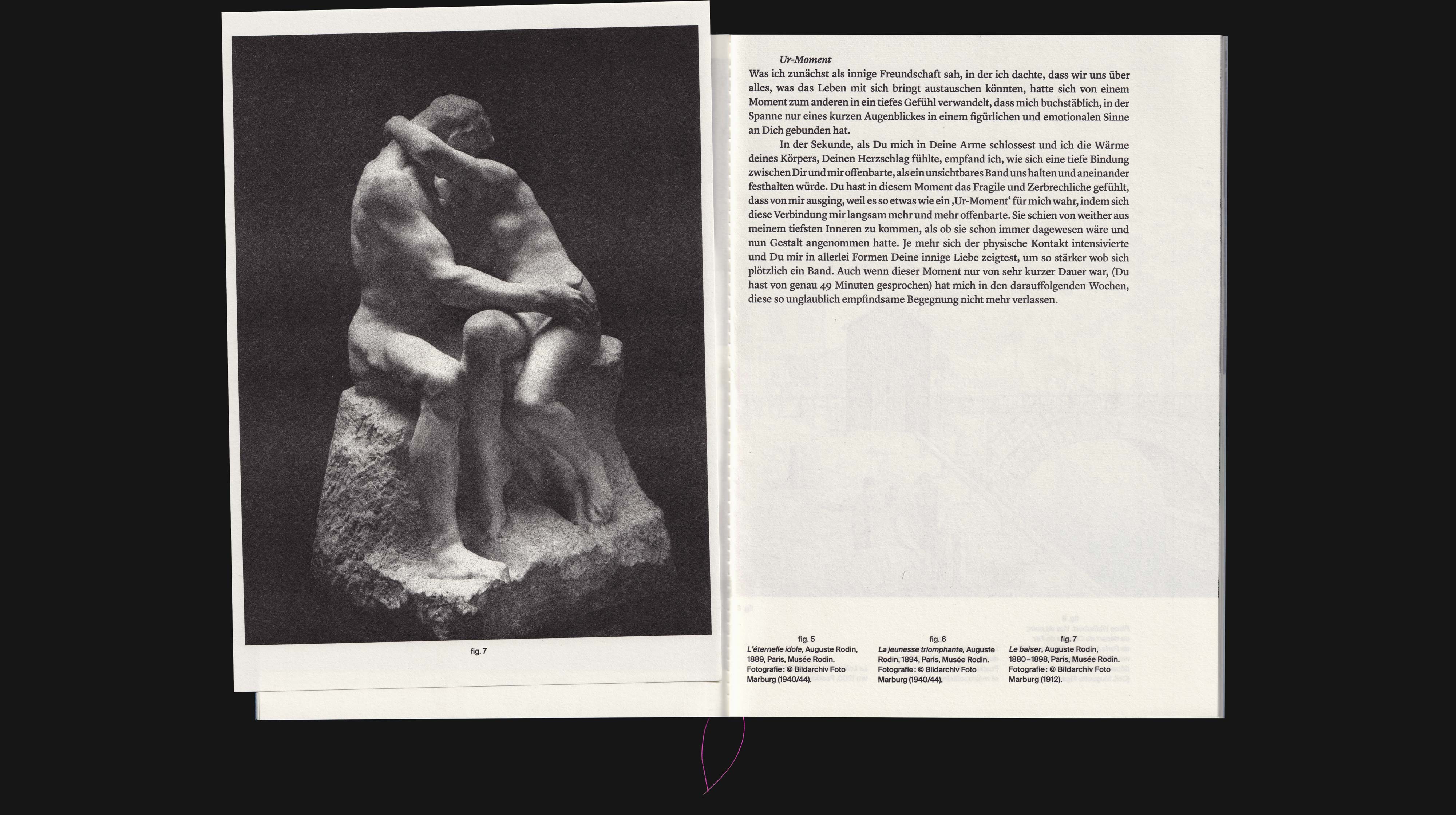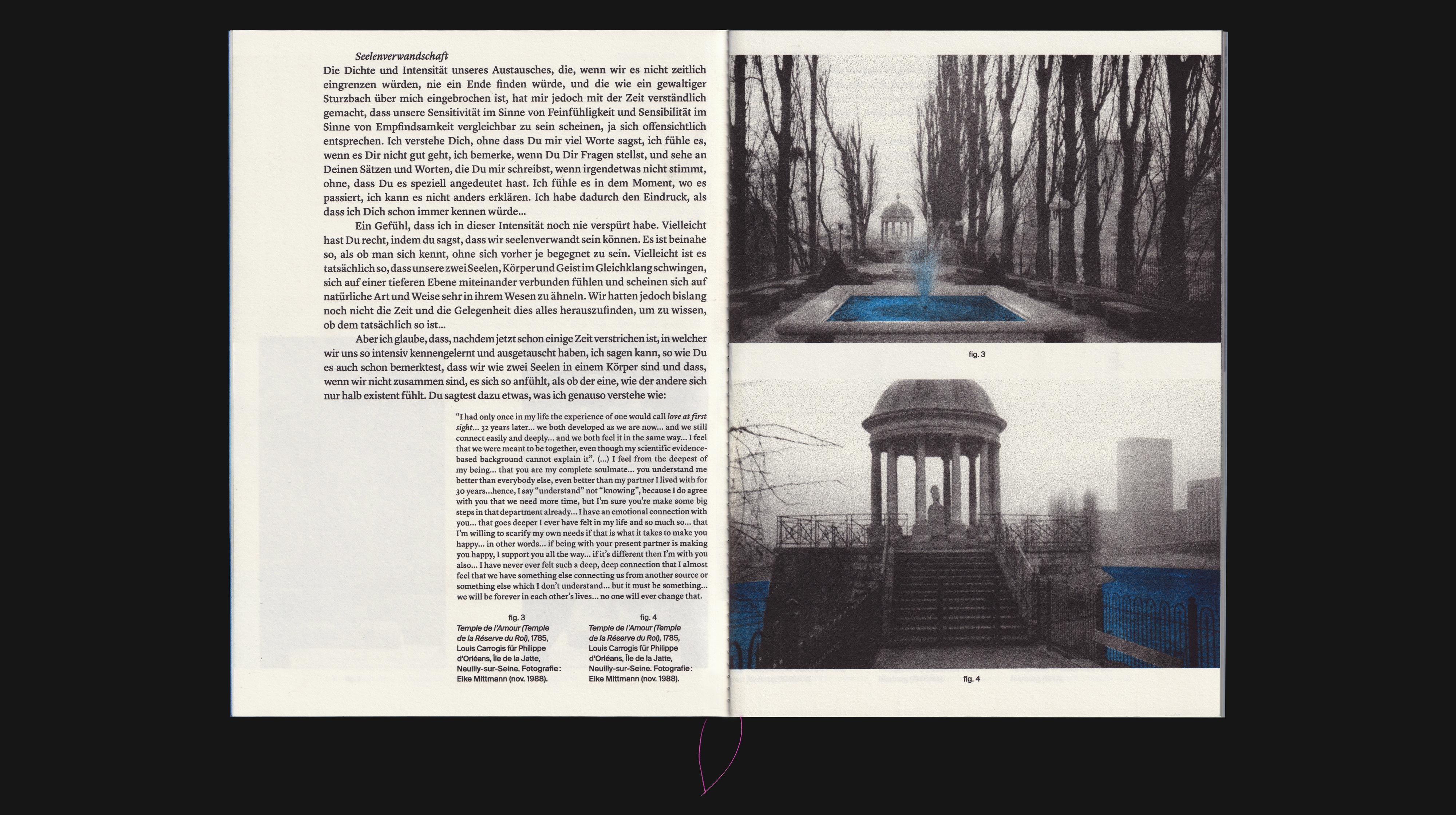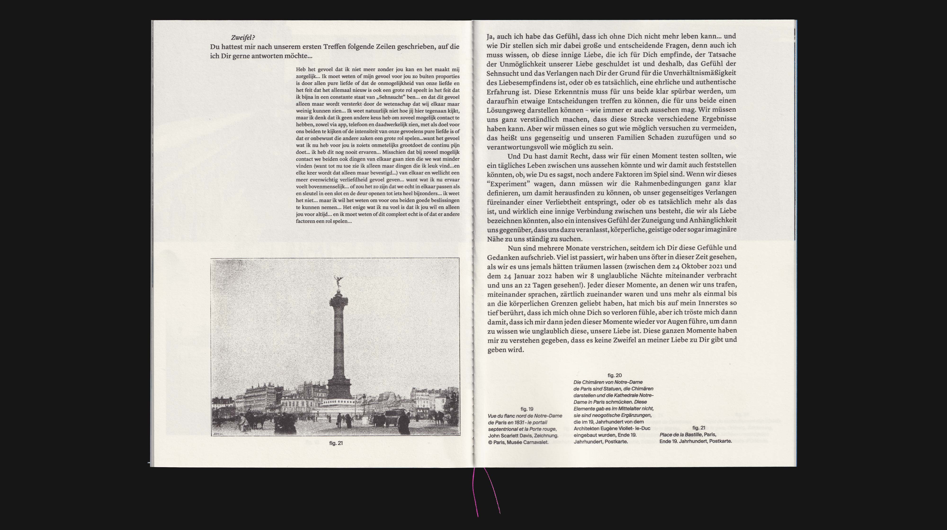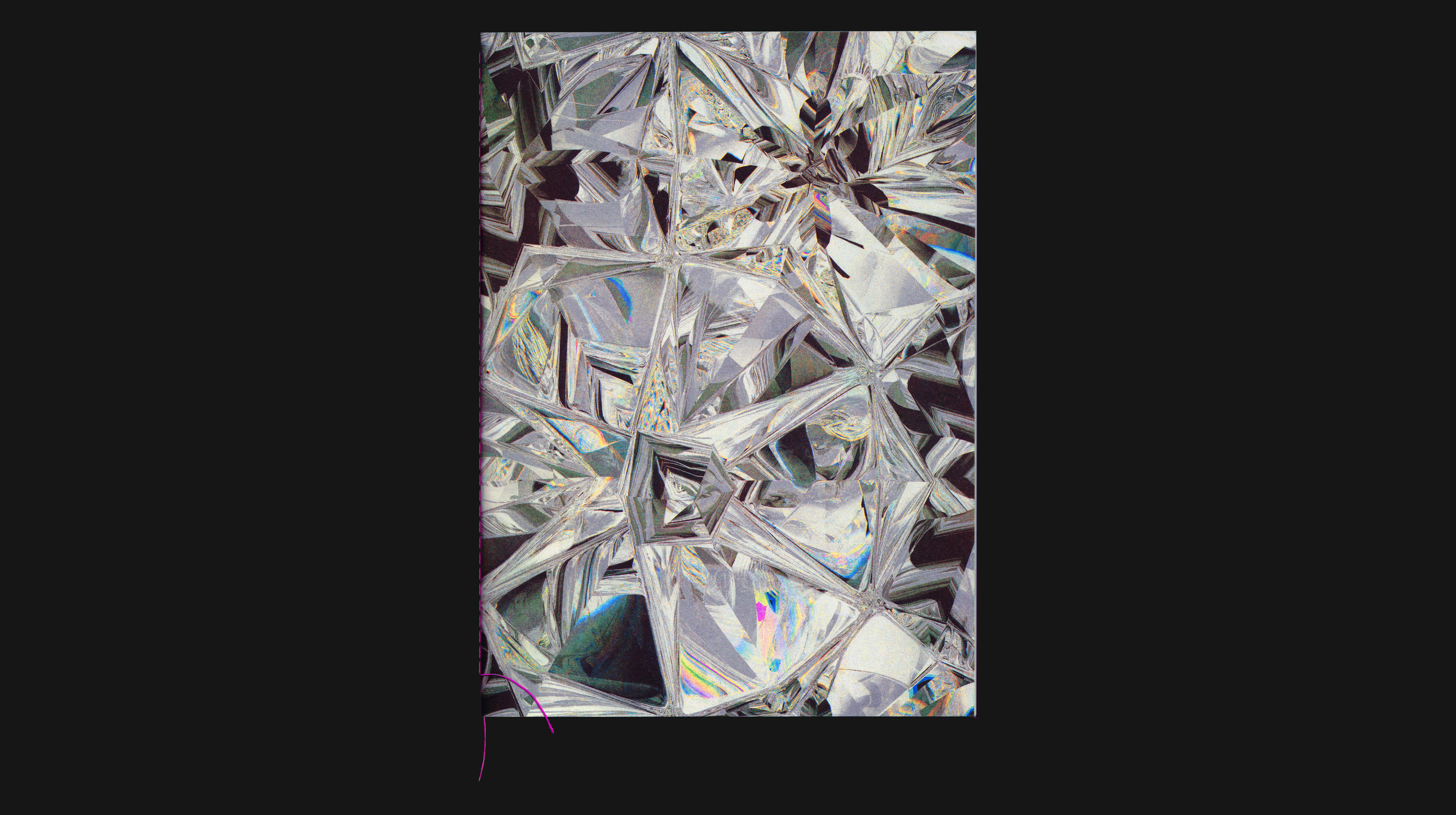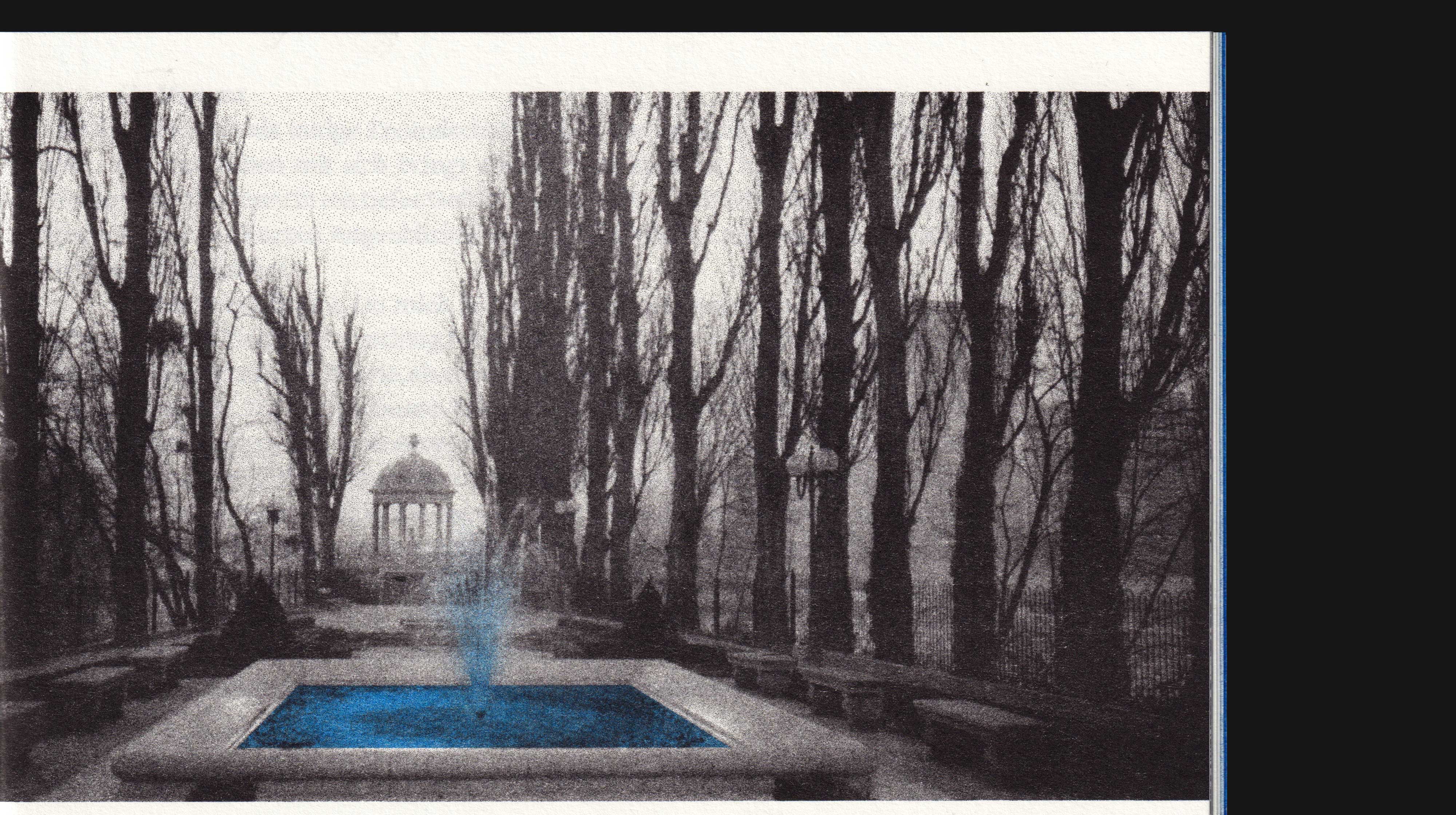 Une histoire d’amour, d’eau fraîche et d’électricité. Création d’une édition très limitée pour Constance le Hardy de Bastogne. Reconstitution d’une fractale de diamant en cinq couleurs pour la couverture (rose fluorescent, argent, jaune, noir et bleu), et retour à une forme d’essentialité en deux couleurs sur les pages intérieures, le bleu accentuant l’eau en hommage au poème d’amour «le jet d’eau» de Charles Beaudelaire. Imprimé et cousu avec soin par Studio Fidèle.