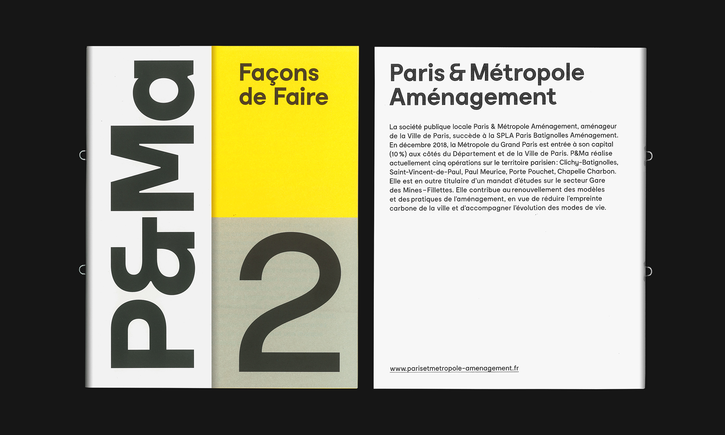 Design of «Façons de faire» booklet, wich present Paris & Métropole Aménagement operating mode and rules to face tomorrow’s challenges. This work enables to share information on recent developments, policies, new trends or innovative practices related to the city planner’s job. The compagny mobilize the collective intelligence to provide innovative energy solutions, including future tenants in the design of the kind of place they would like to live and promoting public facilities sharing.