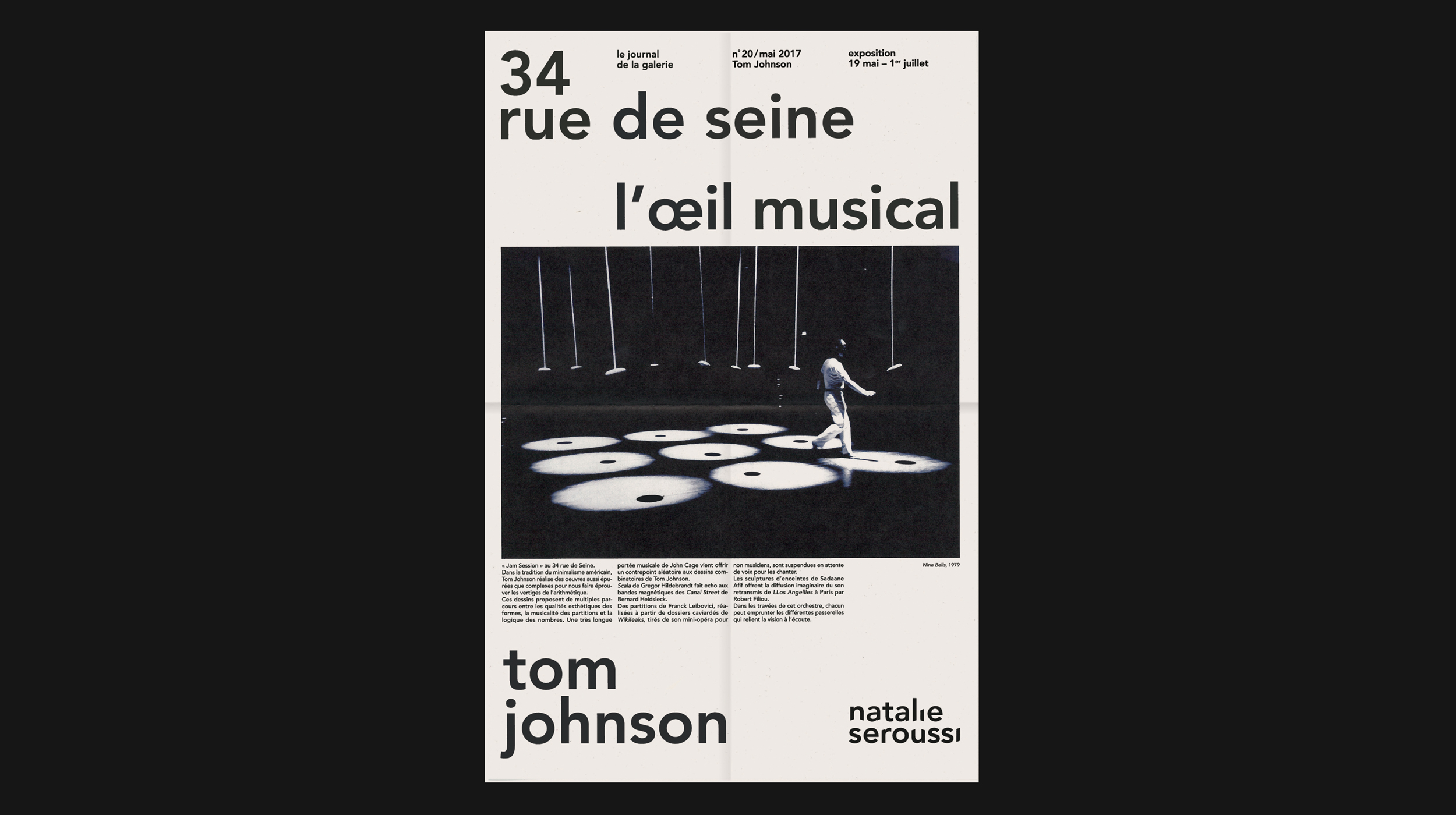 Graphic design of “34 rue de seine” papers #20 and #21 for Natalie Seroussi gallery. In the #20, a symphony orchestra layout introduces Tom Johnson’s work, surrounded by other artists who have also integrated music and sounds in their artworks. The #21 values Kiki Kogelnik’s work, combining text archives to Natalie Seroussi’s words.