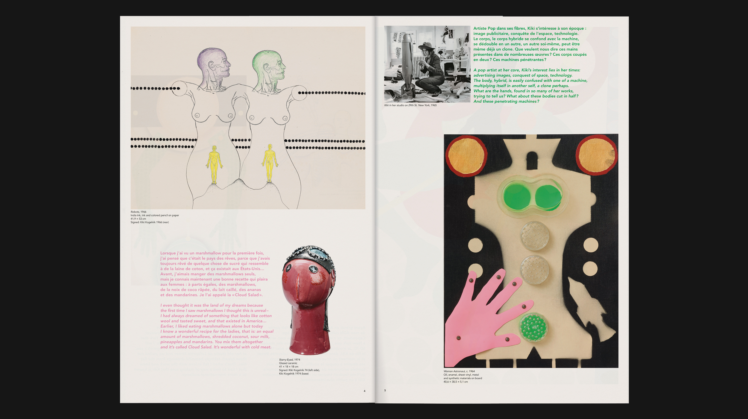 Création des journaux d’exposition n°20 et n°21 pour la galerie Natalie Seroussi (Paris). Le n°20 présente — à la façon d’un orchestre symphonique — le travail de recherche de Tom Johnson, accompagné par d’autres artistes ayant abordé la musique et les sons à travers leur production. Le n°21, édité à l’occasion de l’exposition monographique sur Kiki Kogelnik, mêle textes d’archives aux paroles de la galeriste pour valoriser le travail de cette artiste féministe et engagée.